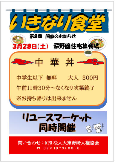 3月28日(土)第8回 いきなり食堂~in深野園住宅~開催しまーす